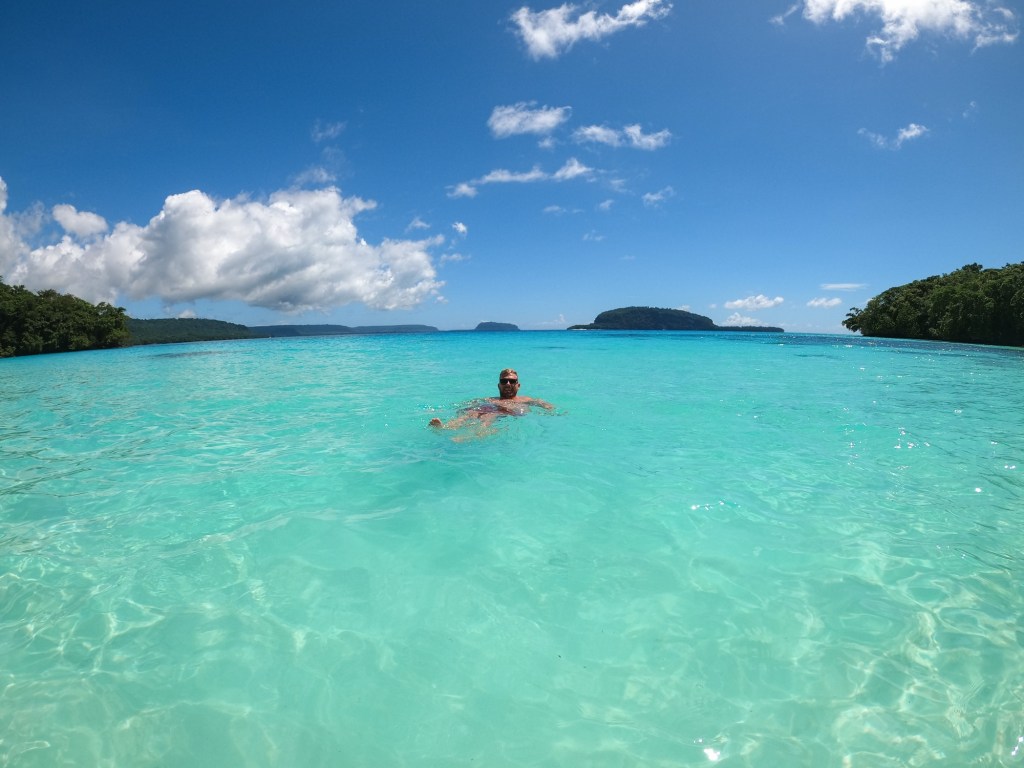 - This meant we spent two days at Lunganville (Santo). Again we booked a tour once we arrived on the island. There was a legitimate tour company in the customs building who we booked through to go to Champaign Beach and one of the blue holes. This cost $80 pp and again children went free.