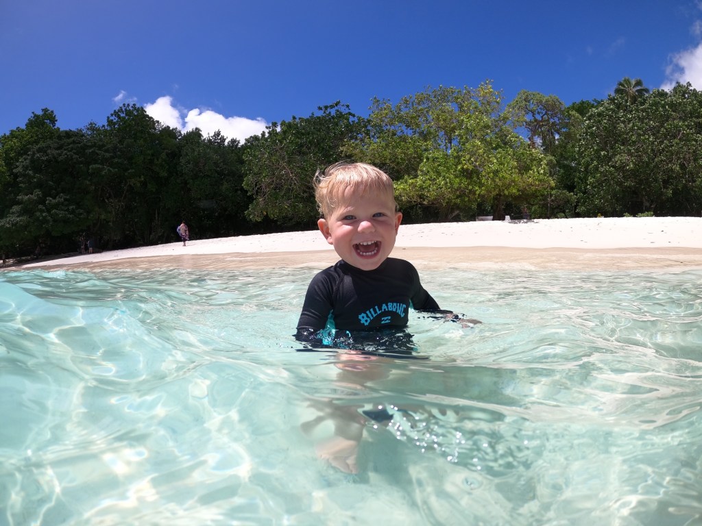 1 big packet of nappies, 2x wipes, rice cakes, sultanas, musli bars, pretzels, hats, swimmers, all our clothes, snorkel and goggles, medical (see below breakdown), 4x swim nappies (we recycle, dry them out then reuse them), arm floaties, a colour in book and pencils, magnetic stacking blocks (we wish we brought more toys due to the lack of activities for Max’s age group).